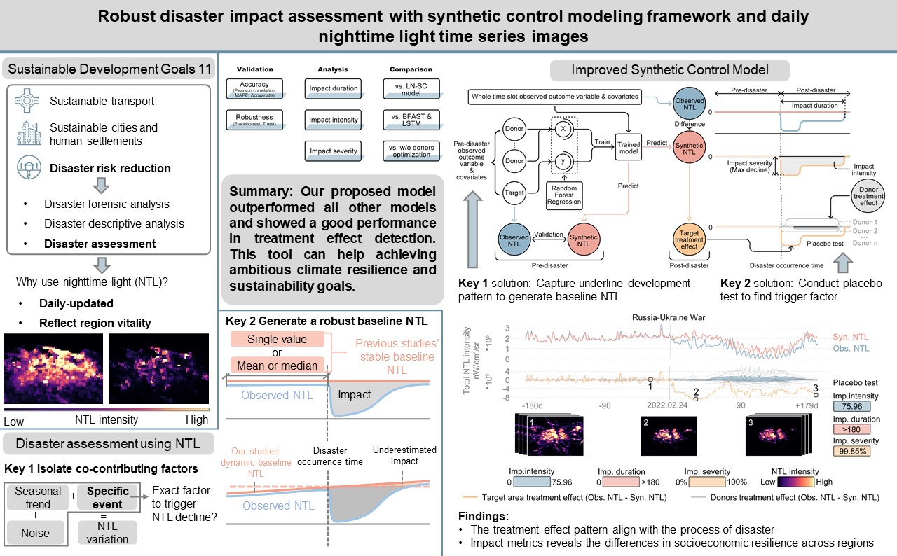 We proposed an enhanced synthetic control framework that integrates dynamic time warping and random forest regression to accurately estimate business-as-usual nighttime light intensity from NASA’s Black Marble data, enabling more precise isolation of disaster impacts from other confounding factors. Our novel approach significantly outperforms existing methods in detecting disaster impacts even at low intensities and short durations, providing crucial insights into regional disparities in disaster coping capacity and socioeconomic resilience to support climate adaptation strategies. (TGRS, 2025)[PDF Online (OA)].